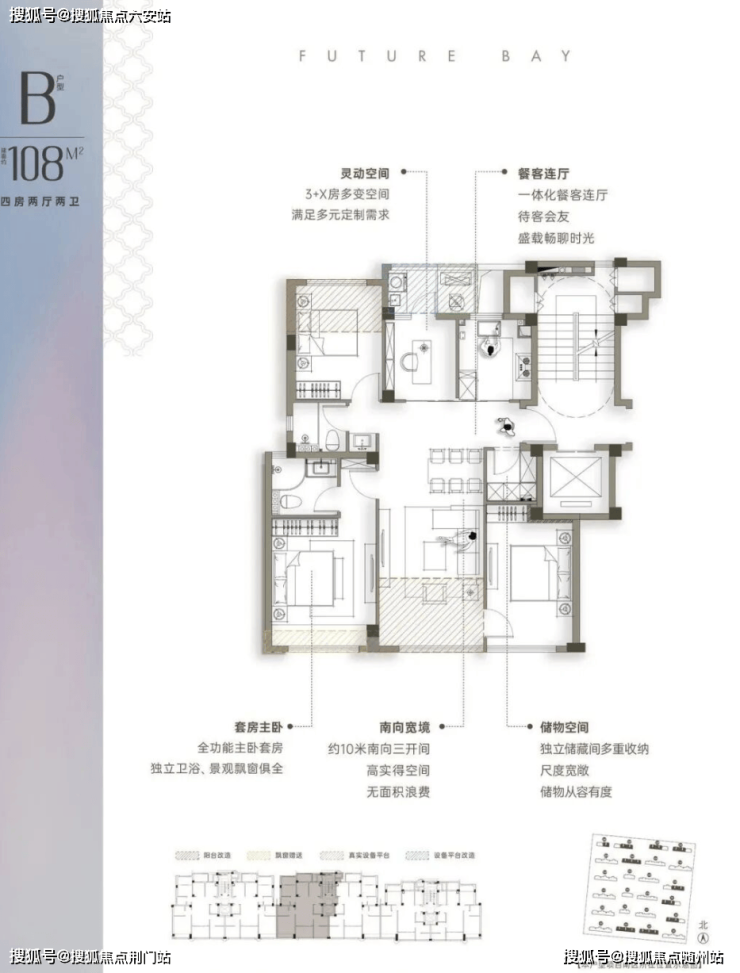 约108方户型:四房两厅两卫:为3+X灵动户型,无连廊设计,确保南北通透,功能分区清晰。采用四叶草布局,卧室分布于四角,互不干扰,保障隐私,同时标配入户储藏间。
