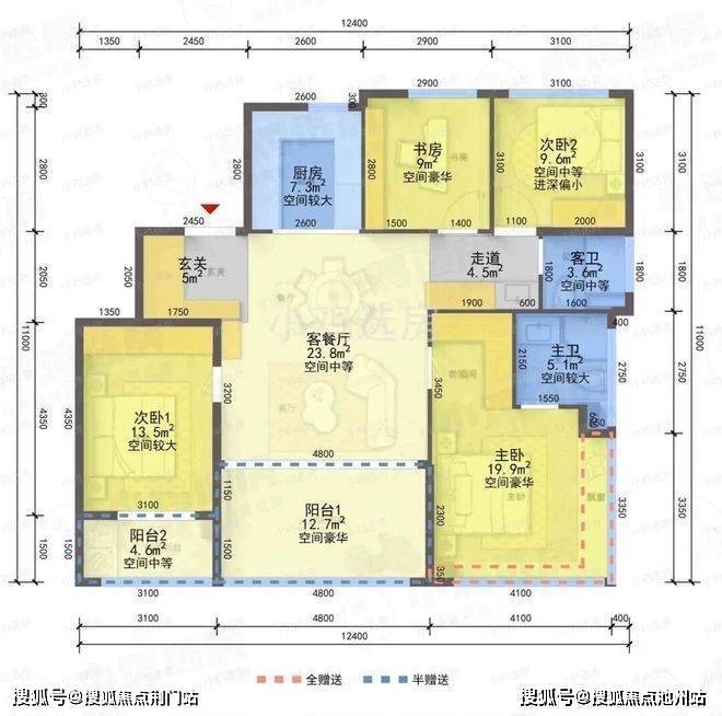 ❶建筑面积约120㎡户型,4房2厅2卫,含赠送得房率约88%。