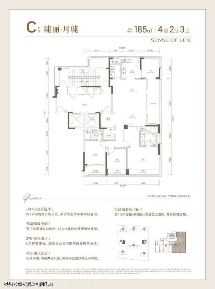 建面约170方户型实现“主卧小家化”,奢华套房式主卧,奢配衣帽间+双台盆卫浴+浴缸,同时配有大飘窗,采光和景观面不输大客厅。