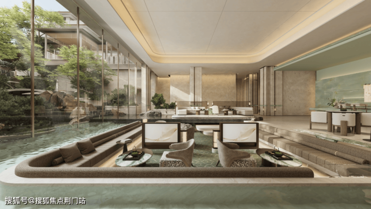 会所设计则汲取《夏山高隐图》的意象,瀑布从石壁倾泻而下,树影摇曳,一派静谧山水,不负临平山下嫡矜宝地。