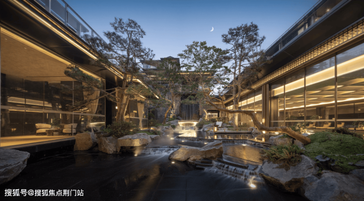 漫步于光影交织的幽静庭院,您将踏入一方充满诗意的天地。潺潺流水映照着婆娑树影,挺拔树姿为这片空间注入向上的生机,纵向延伸出无限的视觉张力。这座下沉庭院,不仅拉近了建筑与自然的情感共鸣,更使室内与景观紧密相连、和谐相融。每一扇窗户,都犹如框中的一幅生动山水画。