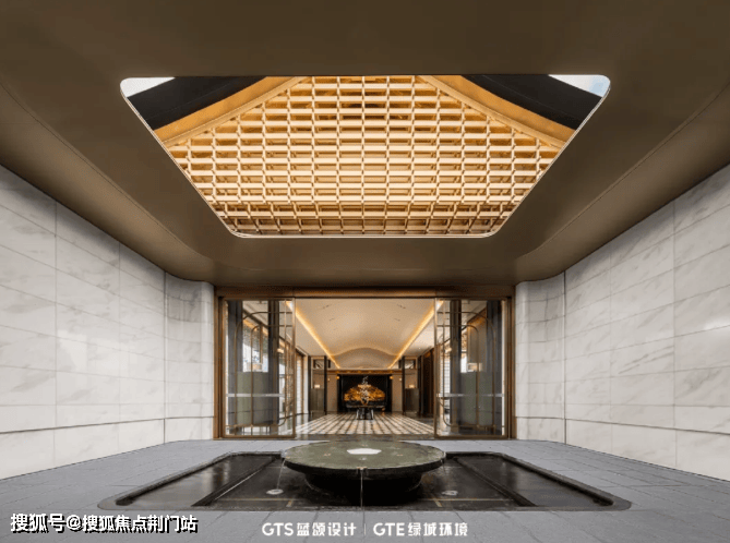 大门两侧辉映的玉石围栏、居中的铜质大门、雅致的穹顶,以及门前两株精心修剪的罗汉松,营造出一份非凡的尊贵与雅致。入口水景以九孔涌泉带来财聚福满的祝愿,中央雕塑以“舟”为灵感,用现代手法打造中式美感。四水归堂以四方水景呼应建筑的形制,浸润着归家的过渡空间。