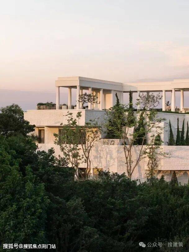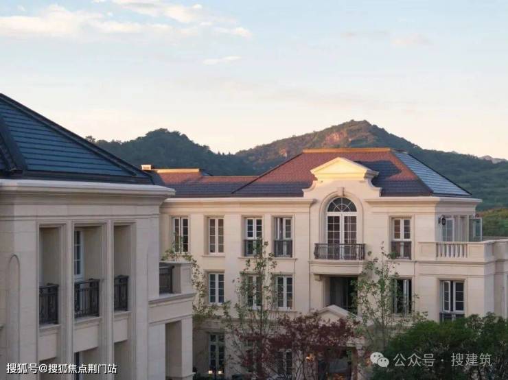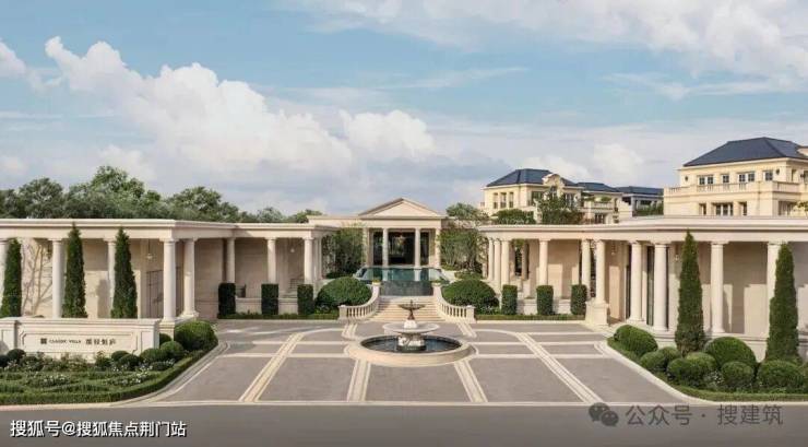 1. 色调纯净,度假美学:立面以浅暖米黄石材为底,点缀金属、玻璃,焕新法式奢华艺术气质。罗马柱与宝瓶柱阵列、隽永雕花,凝练地中海浪漫神韵,恢宏典雅。