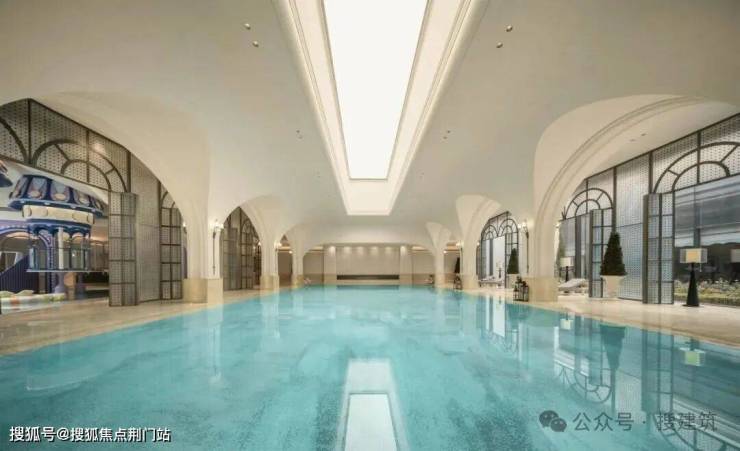 地下恒温泳池三面采光,顶部是15米玻璃天顶倒映着空中花园水景,泳池底部300万片马赛克拼出名画《睡莲》局部。两侧黑色铁艺屏风外是下沉庭院,让业主在游泳的同时也可看到外部的自然景观。