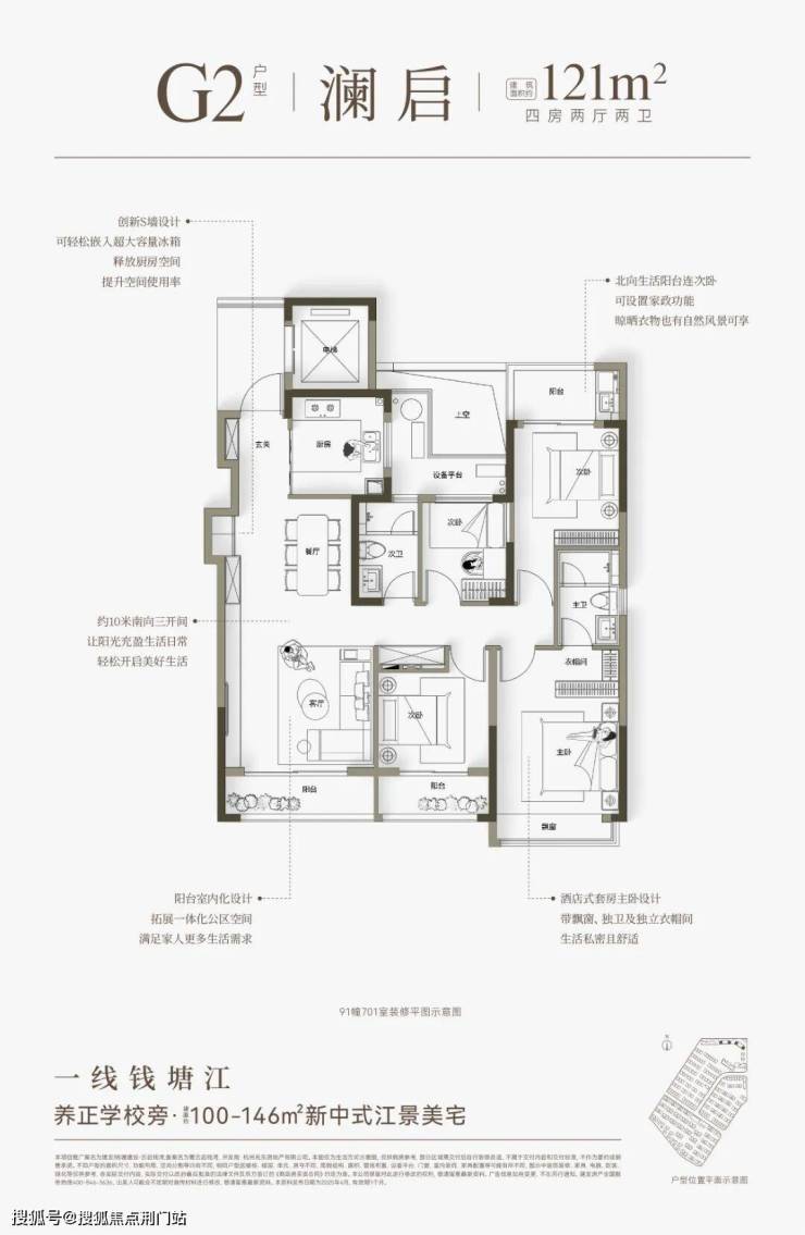 云启钱湾高层分为4种类型,建面约100㎡和建面约121㎡户型,做了创新S墙设计,提高了空间利用率,对年轻家庭来说,也是非常友好的。建面约146㎡四房户型,全部南向面江,大部分楼层还可看到一线江景。