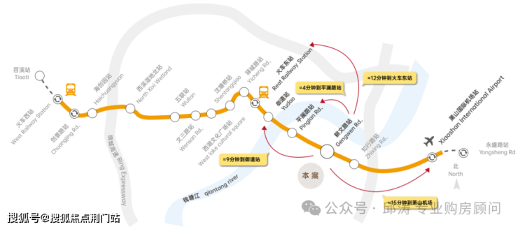 龙湖御潮印直线距离约 300米便是地铁19号线耕文路站,该地铁线被称为 “城市中轴快线”,交通效率极高。从耕文路站出发, 1站即可到达亚奥核心的平澜路站,2站就能抵达钱江新城的御道站,真正实现了与杭州东站、萧山机场、杭州西站等三大交通枢纽的无缝链接,无论是日常通勤还是出差旅行都极为便利。