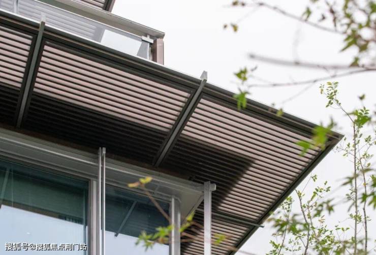 檐口部位对传统“版引檐”进行现代转译,檐下为模仿椽子形式的单元化金属格栅,工业化生产的构件极为纤细且经久耐用。