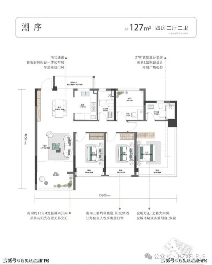 揽景小高层建筑面积约105-130㎡,为最大化景观面,突破性设计建筑面积约105㎡南向四开间。
