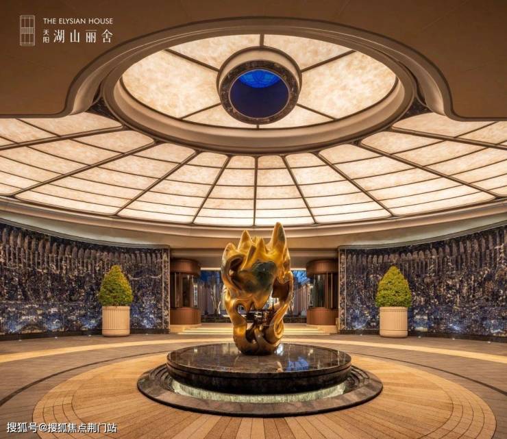 再如,中轴水景宛如展开的宝石匣:池畔蓝翡翠奢石采自马达加斯加稀有矿脉,被誉为石材界的"爱马仕"。冰蓝底色中游动着亿万年前形成的云母纹路,水池中的采光井镶嵌的西亚白冰玉,在透出朦胧光晕,与水面形成"镜中月、水中月、天上月"的奇观。