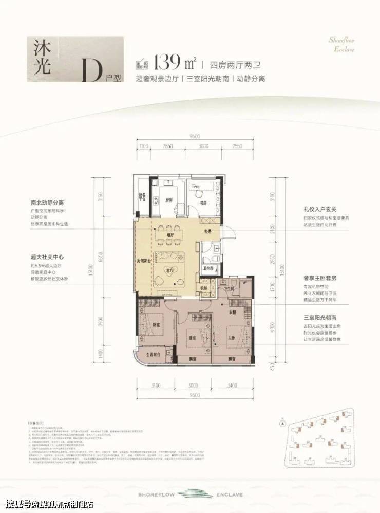 约120㎡B户型做到四开间朝南,约13米南向面宽搭配双联阳台,套房主卧与双飘窗设计营造大平层气场。