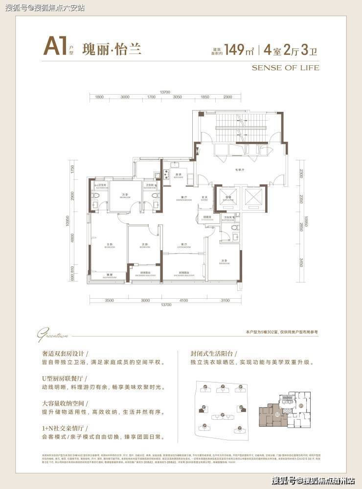以149㎡四房两厅三卫户型为例,实得率约85%,四开间朝南设计让居住空间更加宽敞。170㎡户型实得率高达93%,双阳台设计让居住体验更加宜人。185㎡户型具备双套房设计,兼顾家人私密性与舒适度,适合多代同堂家庭。220㎡户型享有3.15米的层高优势,营造更为开阔的空间感。
