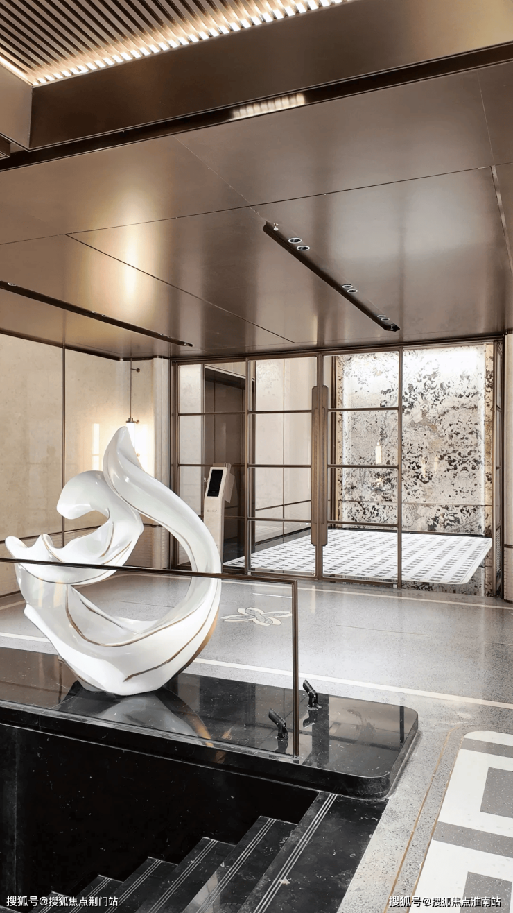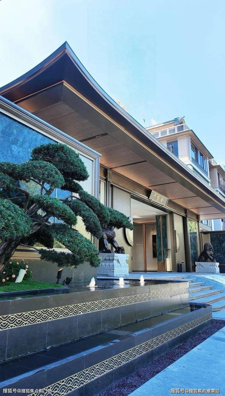 小区大门为歇山顶大门,形制媲美故宫乾清门,宽约53米(含景墙)、高近11米,鸱尾微翘,门两侧各置一块价值百万的蓝翡翠奢石,匹配高约2米(含基座)、重约600斤铜狮镇宅,搭配罗汉松迎客造型树,高定气场扑面而来,再设七级台阶,寓意步步高升,仪式感十足,中式的尊贵感从归家开始就把情绪拉满。