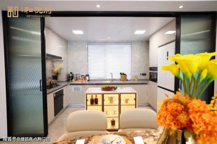 一样被放大的,还有北侧的厨房,面宽约4.1米,甚至还能容纳一个中岛台!这样的尺度,甚至可以媲美大平层的豪宅!