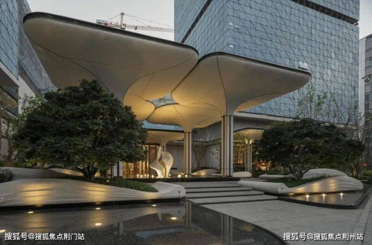 水景以三面环抱之势映衬建筑太空舱,使其在视线上宛如漂浮于镜面之上,营造出建筑轻盈悬浮的诗意画面。
