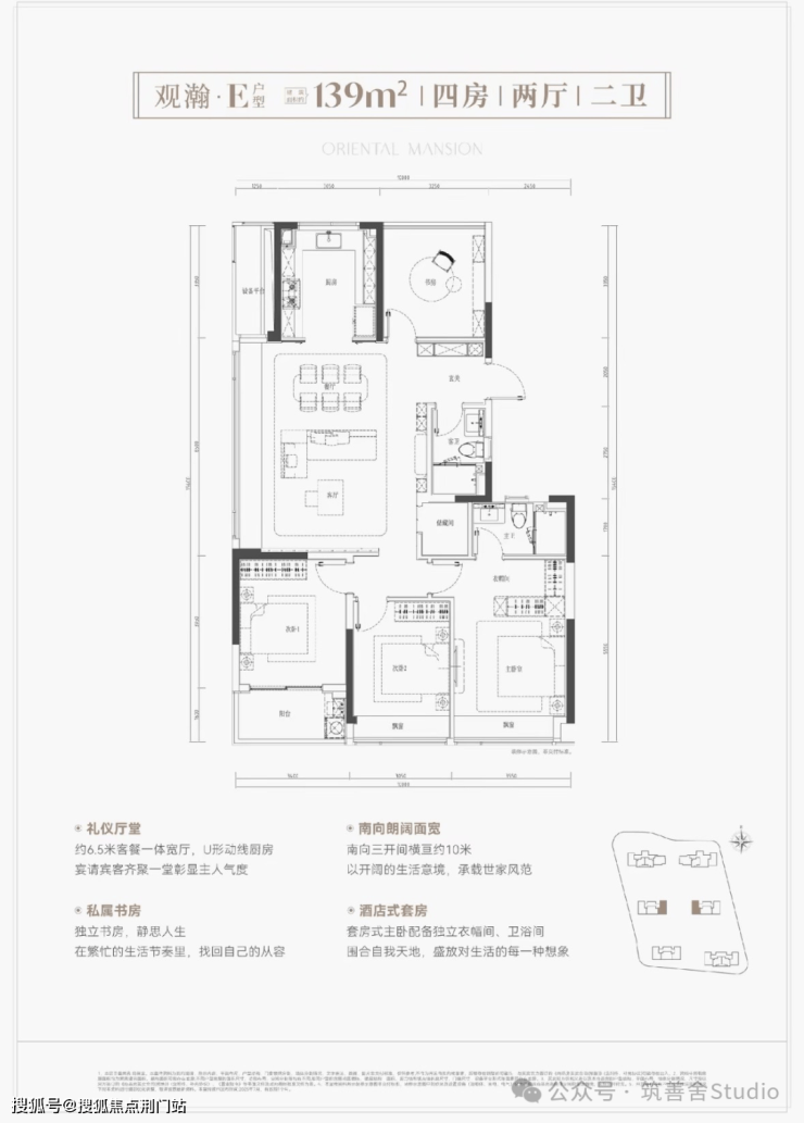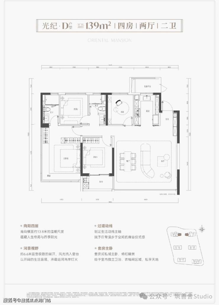 139平米“竖版”户型,得房率高达约93%,空间利用率卓越; 南向三卧设计,采光充沛,完美适配二胎及三代同堂家庭需求; 客厅面积约37平,开阔大气,并配备约2.6平独立储物间,实用性强。