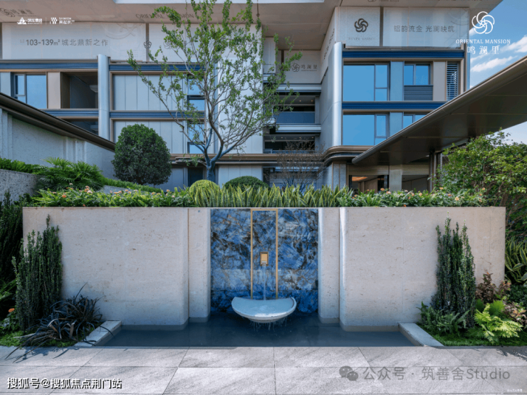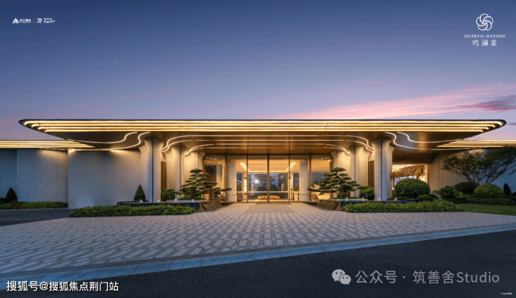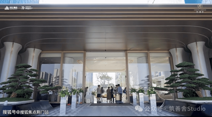 小区主入口采用现代化酒店式门楼设计,跨度达66米,融合金属与玻璃材质,彰显都市美学。两侧石材景墙如屏风般展开,对称种植名贵罗汉松,整体气势恢宏,归家仪式感十足。