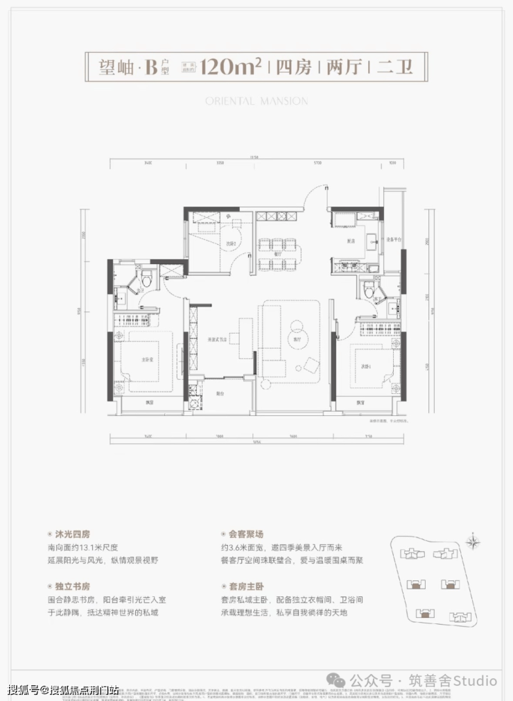 建面约120平米户型,四居室户型,同面积段罕见的约13.1米南向超大面宽,四间卧室面宽均超3米,南向主卧与次卧分列客厅两侧,私密性极佳;客餐厅与阳台无缝衔接,空间开阔大气,采光更佳;主卧采用套房设计,舒适度全面升级。
