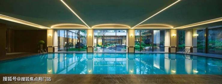 恒温泳池约25米的恒温泳池,采用双面大落地窗设计,将社区园林的绿意引入室内,池畔休憩区铺陈柔软沙发。
