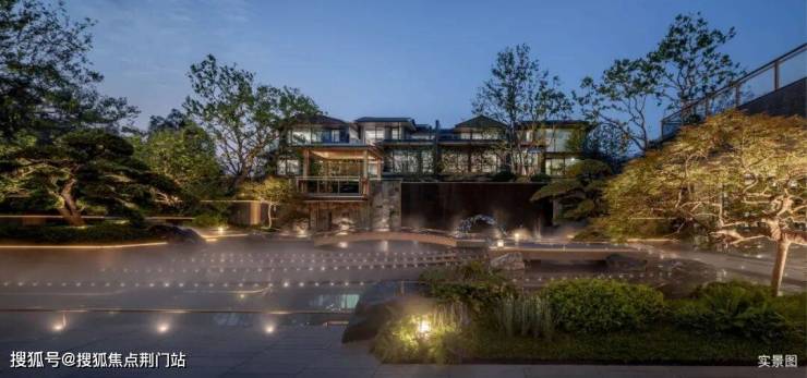 主入口灵感源自《溪山行旅图》,山水与楼阁结合地形做抬升,山水松阁、飞石流瀑,用层叠的黑金砂石做出宋画中的山体