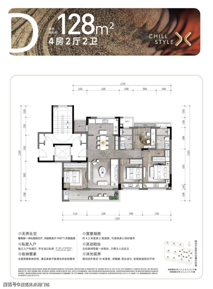 建面约128方四房两卫户型,“餐客厨”一体创新式设计,与市场上相似产品相比,使用率更高,PARTY感扑面而来。