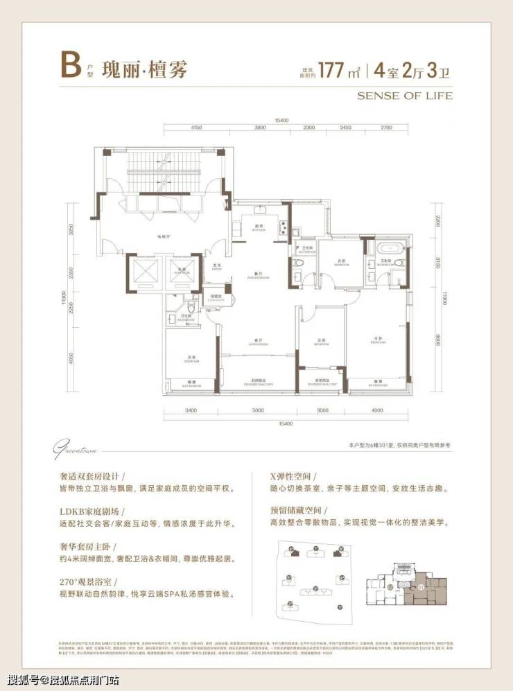 建面约177㎡的四房,保持四开间南的格局,但尺度进一步拉大,将阳台包入之后,整个LDKB公区会放大到约40㎡。