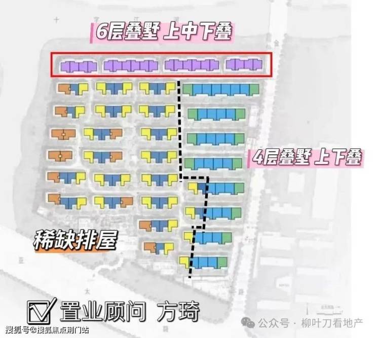 4层叠排为上下叠,6层叠排为上中下叠。外立面效果图上看建筑线条简洁利落,顶部勾勒飞檐翘角,与周边自然景观呼应,强化了低密产品的度假感。