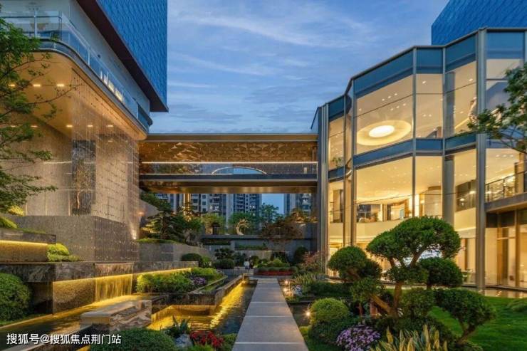 整体的抬高,让约70米宽的鎏金天幕大门头高度达到了约9米,显得格外气势非凡。天桥连接了会客厅、架空层和内部园林。