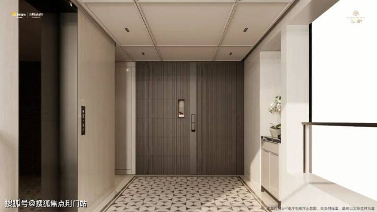 首先入户就是一个非常敞亮的前厅,不仅尺度比同级更大,而且是能直接“用”:地面拼花岩板,有背景墙装饰,还做了造型吊顶,绝对是“精装独立电梯厅”。实际使用率堪比市面不少170㎡+户型。