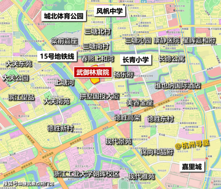 先看区位,武御林宸院位于拱墅区三塘板块,北侧约500米为城北体育公园,不远处为在建地铁15号线三塘站,西侧约200米为上塘河。