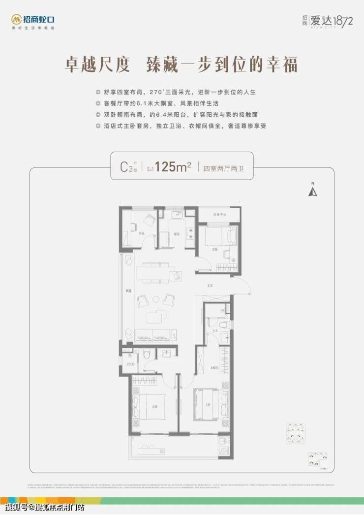 在户型上,其中建面约106㎡户型完美契合年轻人的置业需求,无论是LDKB一体化设计、正三房+双卫的格局,还是约3.5南向大开间、“1+X”创变空间的尺度,都做到了改善级空间感;而建面约125㎡大四房户型则以270°三面采光、奢阔客餐厅、双卧朝南等创新布局,为置业者实现一步到位的生活。