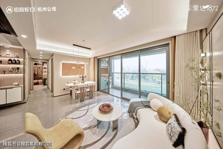 对刚需而言,有限的预算,爱达1872直接配了全套,自然不能错过。建筑外立面上,不同于传统的完全对称,而是以局部非对称的设计,让建筑看去更为灵动。外立面以灰白色调为主,使用了涂料、局部铝板、石材与玻璃的组合 。在建筑顶部,招商增设了香槟色的飘板设计,刷新区域立面的美学高度,极具辨识度。