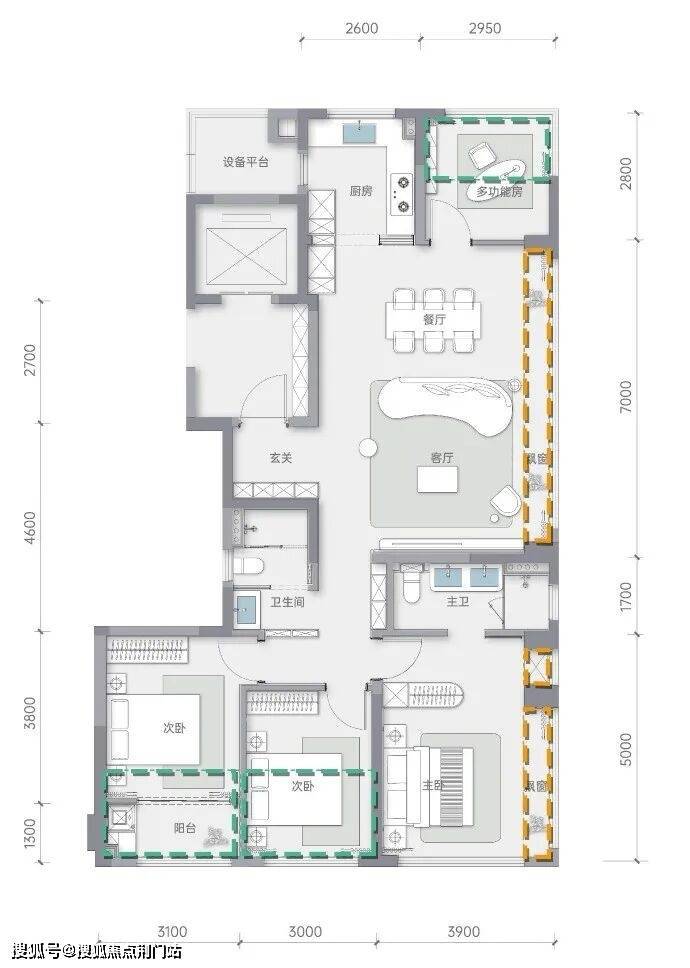 138㎡边套户型,边厅与主卧的连续飘窗总长近12米,南向三个卧室的采光面总长约10米,与137㎡边套一样,都是名副其实的“光之屋”。