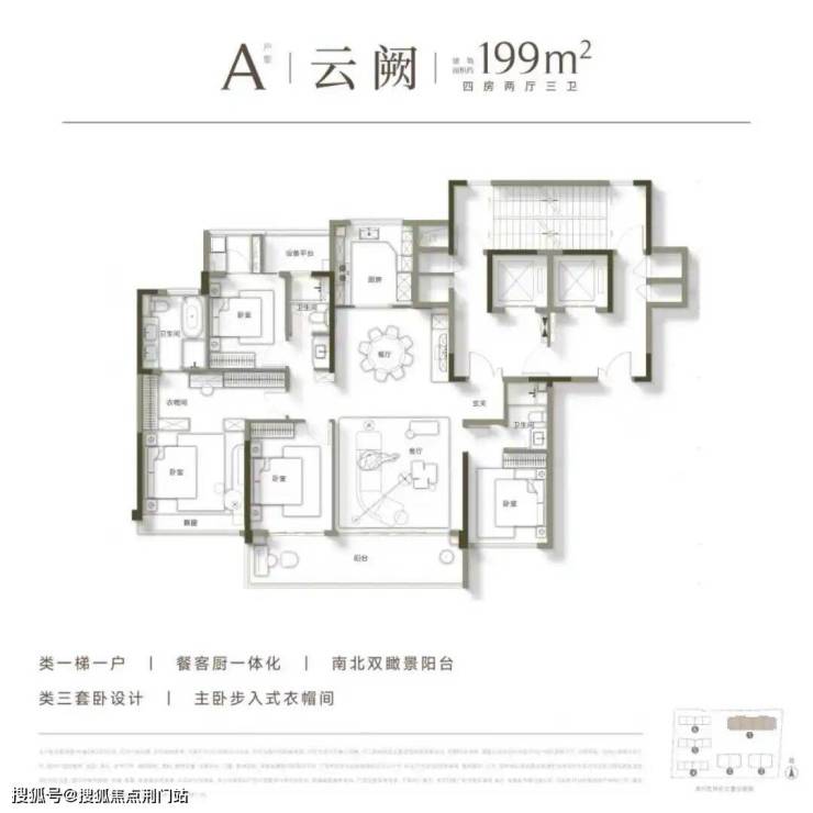 首开(建筑面积约)199㎡A户型,四房两厅三卫设计,拥有豪华双套卧+南北双阳台,甚至每户还赠送储藏室,据说实用率高达92%。