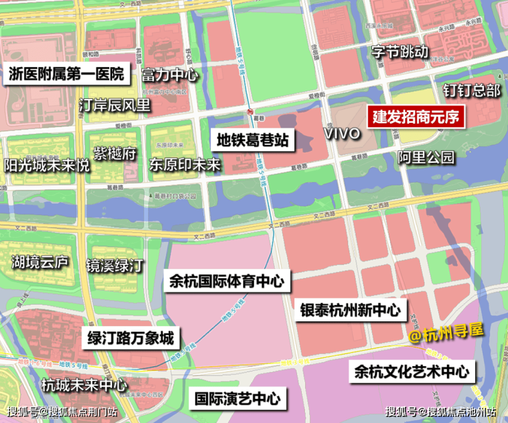 建发招商元序位于地铁5号线葛巷站附近,东西侧紧邻钉钉总部、VIVO,距绿汀路万象城约1.5公里,地段还是比较中心的。