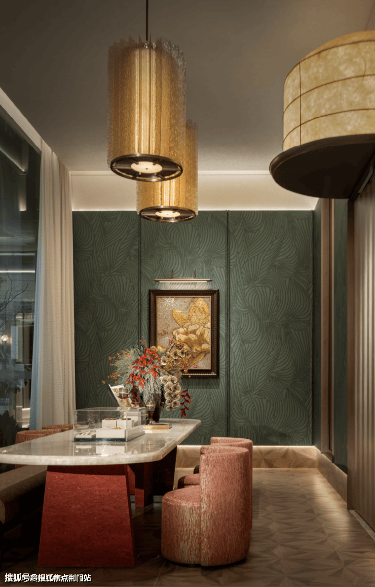 琉璃壁灯如流萤般栖于沙盘区,搭配层叠造型的罗马帘,半透褶皱柔光散景,保留自然光影的流动诗意。