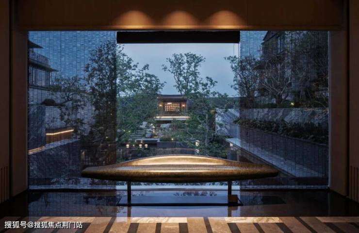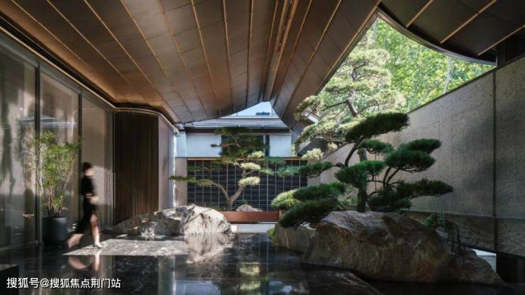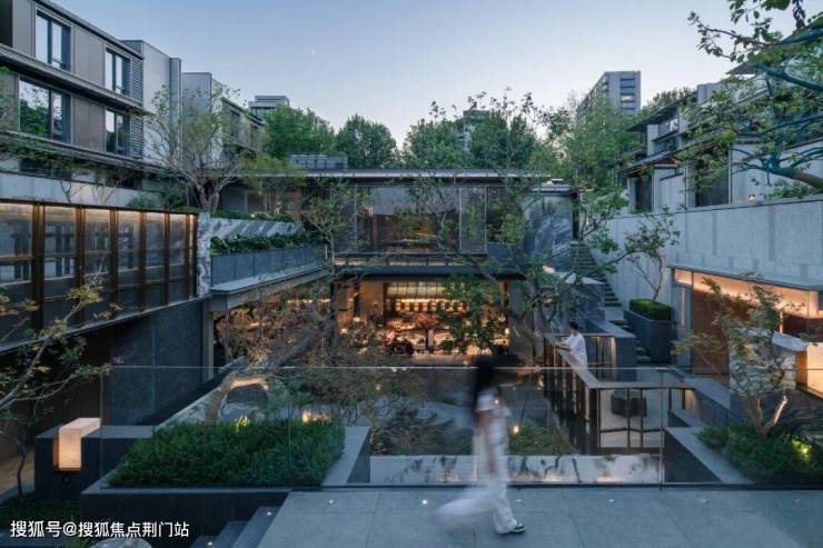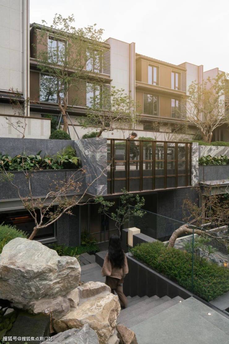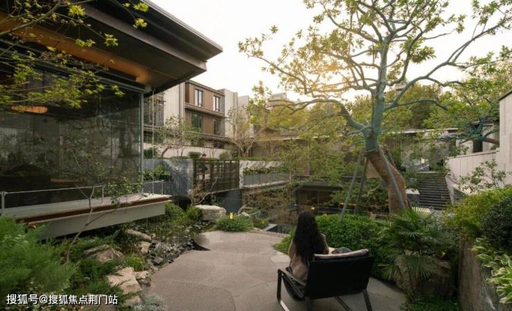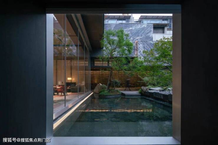为此,立体庭院布局以中央水体为核心,建筑体量环抱形成向心秩序,有效强化了场域的凝聚力。游步穿行间,巨幅玻璃借现代框景手法,将外部景致抽象为动态立轴,通过尺度对比与光线渗透构建多重叙事。这一策略延续了宋式园林注重精神性与自然交流的美学,在狭小用地中拓展出幽深静谧、虚实相生的意境体验。