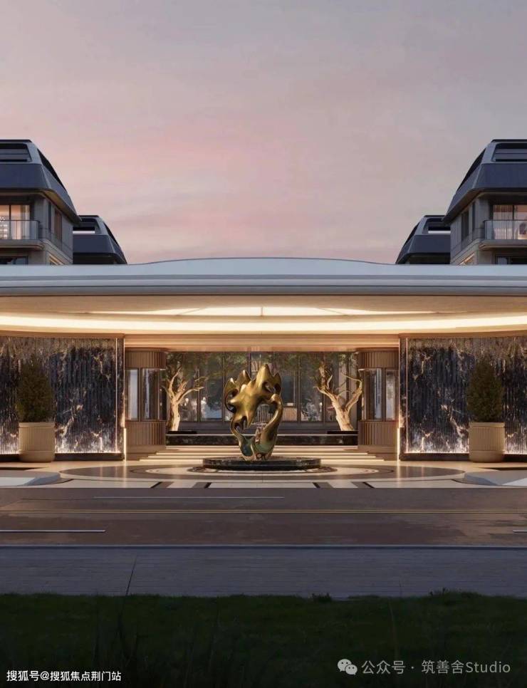 湖山丽舍巧妙运用暖色调石材与铝板的和谐拼接,精心复刻出自然与人工的和谐秩序。每一石面都经过细致雕琢,弧线流畅、倒角精致、线槽深邃,宛如将一首宏伟的交响乐转化为触手可及的立体雕塑。继而,以大量玻璃栏板和落地窗的巧妙搭配,以及阵列式长窗的独特设计,为建筑注入了无限灵动与通透之美,完美契合现代审美的潮流与生活的舒适需求。