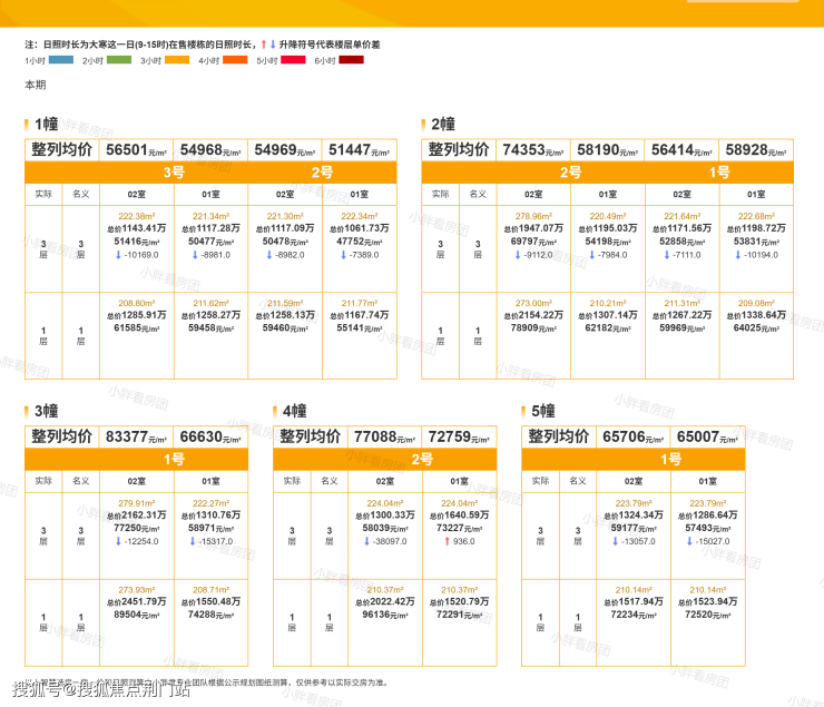 具体来看:1幢8套房源,均价54354元/㎡;2幢8套房源,均价62681元/㎡;3幢4套,均价75905元/㎡;4幢4套,均价74631元/㎡;5幢4套,均价65135元/㎡。