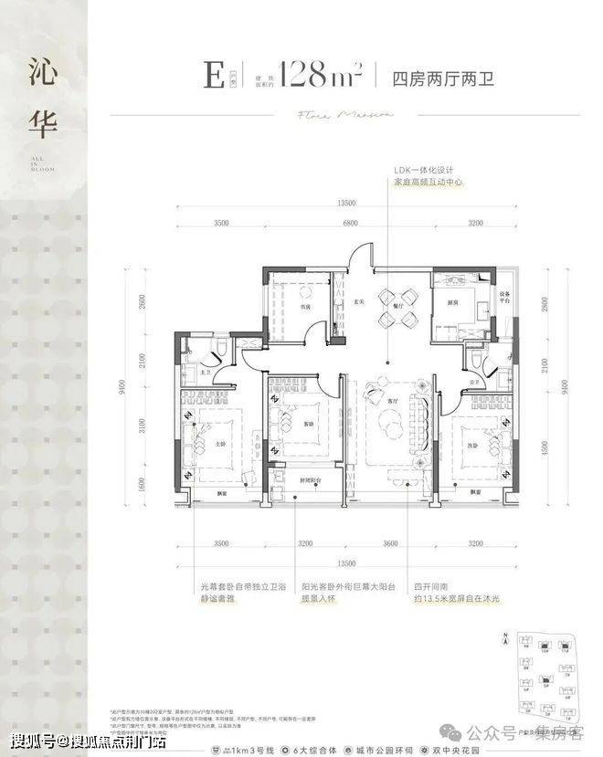 建面约128㎡的四房两厅两卫户型,四开间朝南,南向面宽达到13.5米,全家人的起居、生活空间都为南向,将平权发挥到极致,南向采光十分充足,且拥有封闭式阳台,使得整体空间更加宽敞明亮。北向书房也可以作为备用房间,满足四房使用功能。