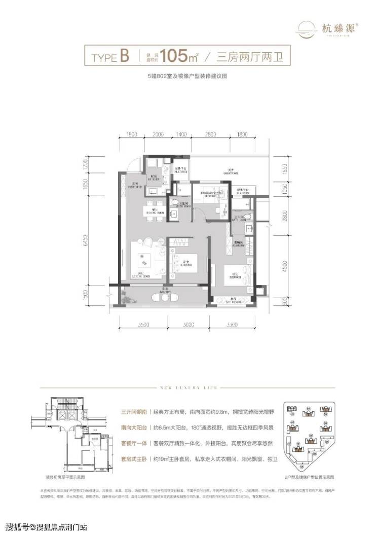 该户型为项目的三房起步户型,建面约105方,为三房两厅两卫的设计。