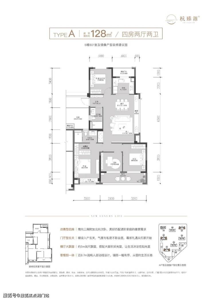该户型为项目的四房起步户型,建面约128方,为四房两厅两卫的设计。