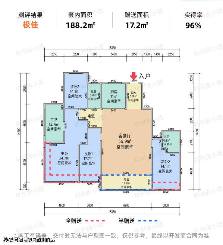 1.建面约145方3+1房2厅2卫:(注意下图客餐厅位置实际为x空间,交付时可能会隔成房间,所以也可以算4房)