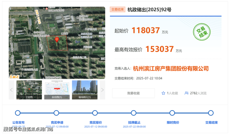 2025年7月22日,杭州滨江房产集团股份有限公司(滨江房产)以总价153037万元竞得杭州市余杭区良渚东单元YH030304-08地块,成交楼面价为17472元/㎡,溢价率为29.7%。