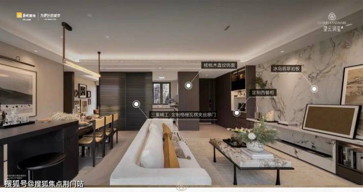 还不止,大到豪宅才有的嵌入式冰箱,小到顶喷花洒、主卧镜柜里的美妆冰箱等,都是交付标准,就连次卫也首次配置上了智能马桶;不断映入你眼帘的,还有各种木饰面、奢石、岩板,以及定制款龙头、门把手.....