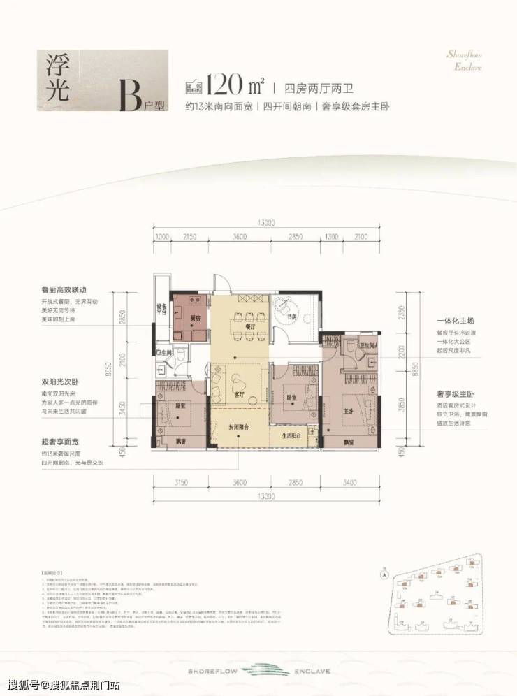 建筑面积约120㎡B户型,采用了四开间朝南的排布方式,总面宽约13米。三个卧室和餐客厅均朝南,让每一个空间都拥有南向阳光平权。餐客厅和次卧连接了一个双联大阳台,双飘窗,赠送面积多。而且客卫就在次卧边上,生活起居也是便捷不少。