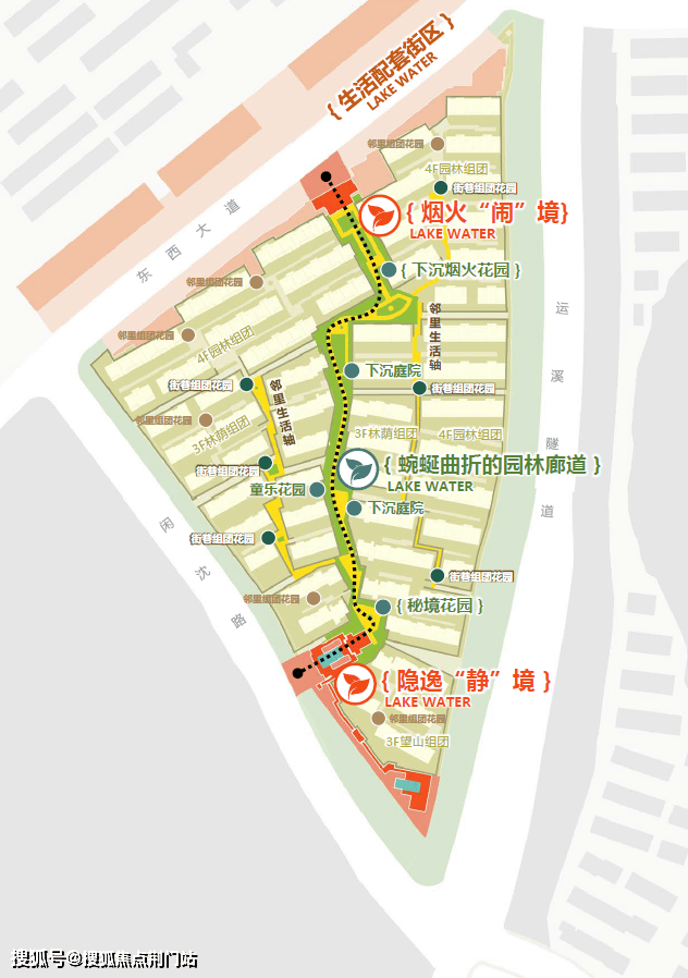 该地块在概念层面,以东西文化中相同的“永恒”概念串联南北地块,从西方的文化象征与审美结晶中寻找美学的永恒,从西湖的山水意境中寻找人文图景的永恒。将经典图景融入项目,形成由时序胜境、雅典卫城、不朽艺廊、枫丹台庭、恒晖水境、印象芳庭组成的法式地中海美学“恒韵六境”和翠幕云垣、云泊映恒、恒庭境、映天阙、映月长漪、渡月虹坞组成的“溪山恒境”,通过蜿蜒水轴串联交融出南北两种不同风格的景观,达成不同的景观情境,和谐的景观感受,展现两种气质不同却又和谐共生的居住体验。