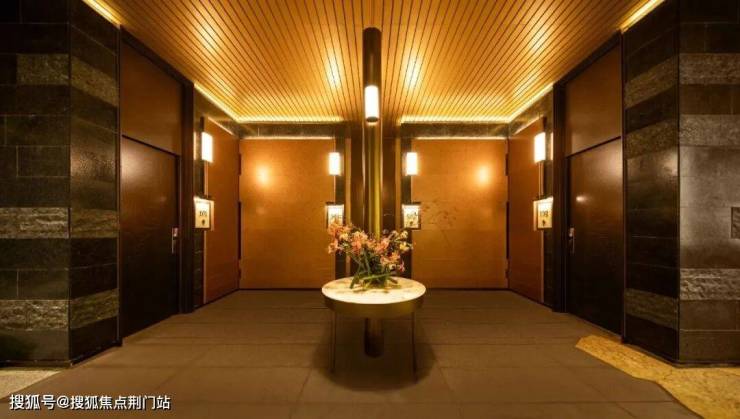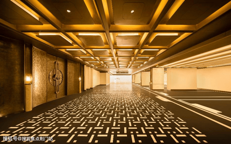 主入口横向延展面达90M,门头采用庑殿形制,以大规格金色金属对称式屋顶,强化归家礼序,立面以透光碧玉奢石呼应“天青”之美,结合星空闪耀的流水景墙,打造“光之水韵”,共同还原古运河形态。