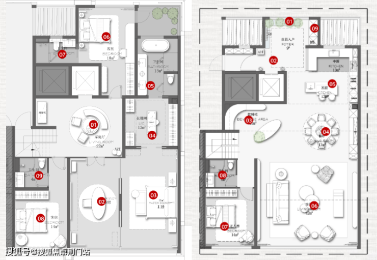 比如建面约270方的下叠,大客厅大厨房大主卧,每一层的空间都很享受,尤其一楼还连通了近100方的院子,不论是看起来还是用起来,都是大宅的体验。