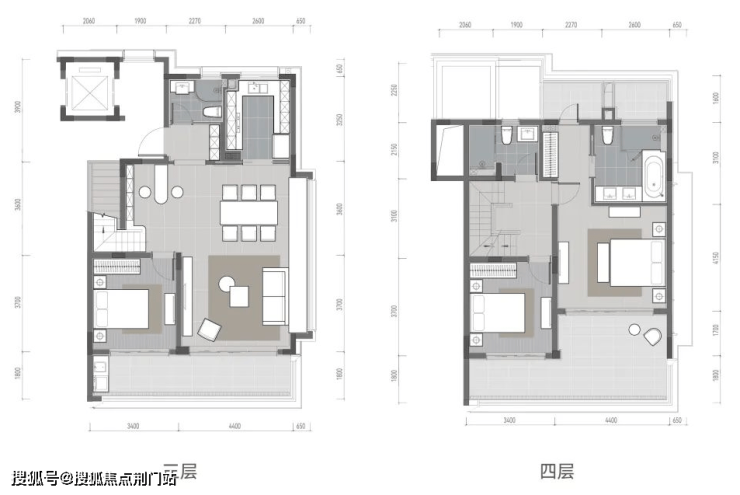 以约155㎡上叠为例,3楼有约14㎡宽景阳台,4楼南面是约22㎡大露台,北面有近8㎡小露台。屋顶还有个带“光盒书房”的星空露台,面积约60㎡。阳台露台加起来,总面积超100㎡!