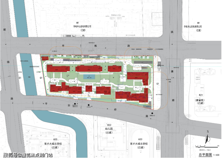 项目的主要出入口位于南面的平安桥路,从这里进到小区内部有泳池、景观构架、集中绿地等配套。